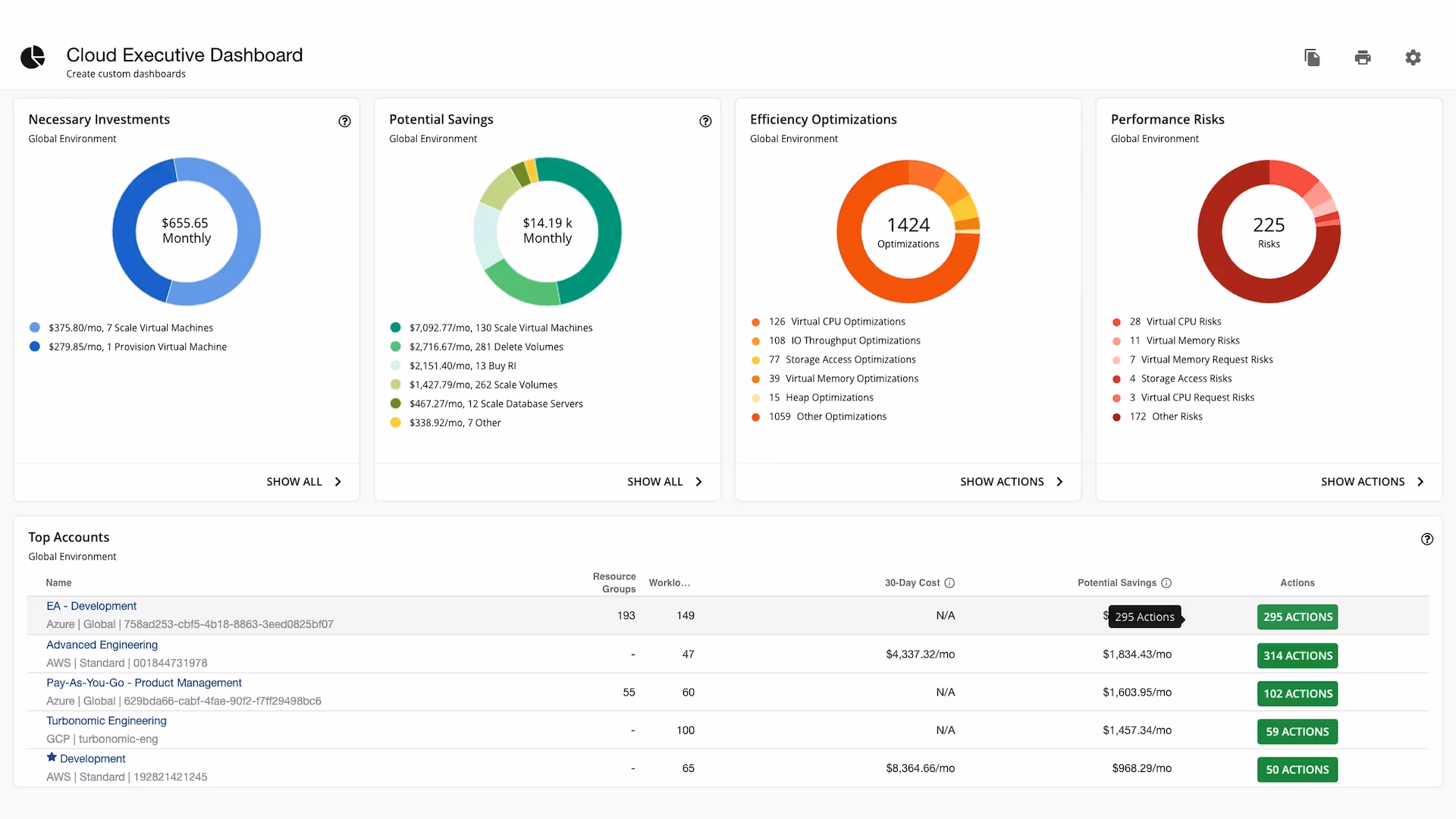 Aria offers visibility into every dollar spent and can automate rightsizing across clouds. The platform highlights underutilized instances and unused reservations, and can automatically adjust capacity to reduce spend, if configured to do so.