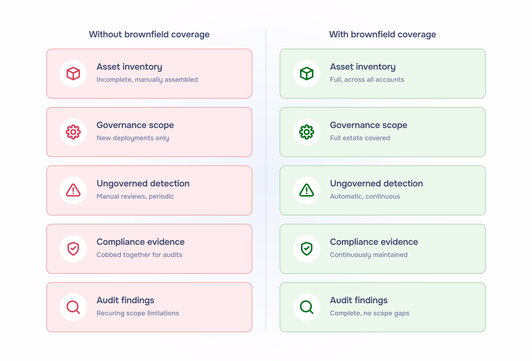 A governance model that only covers some deployments produces evidence with a scope limitation. That’s a finding in most frameworks. Fully controlled brownfield onboarding, combined with periodic discovery audits, fixes that.