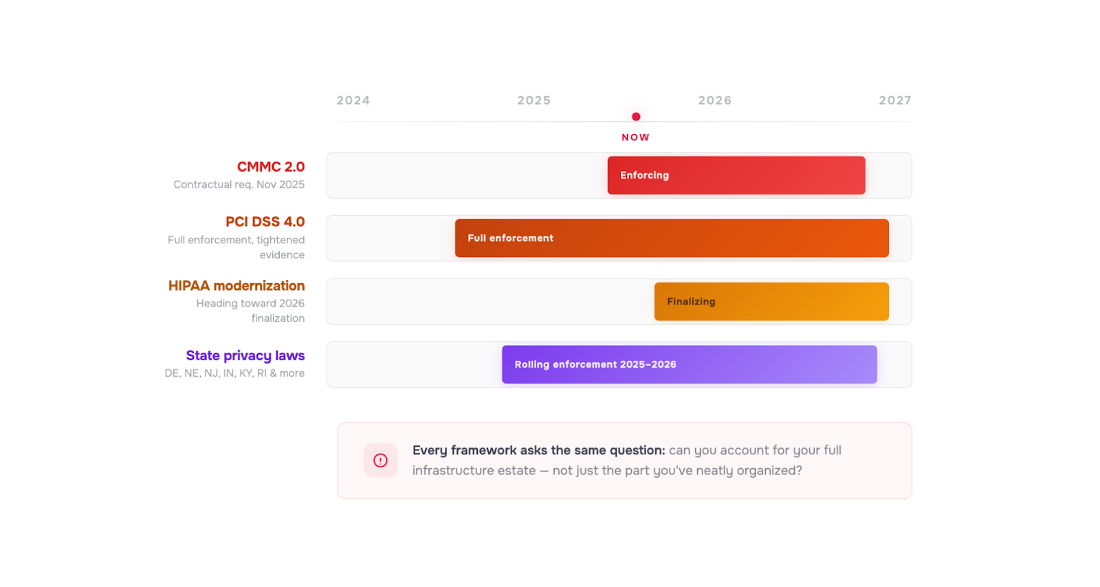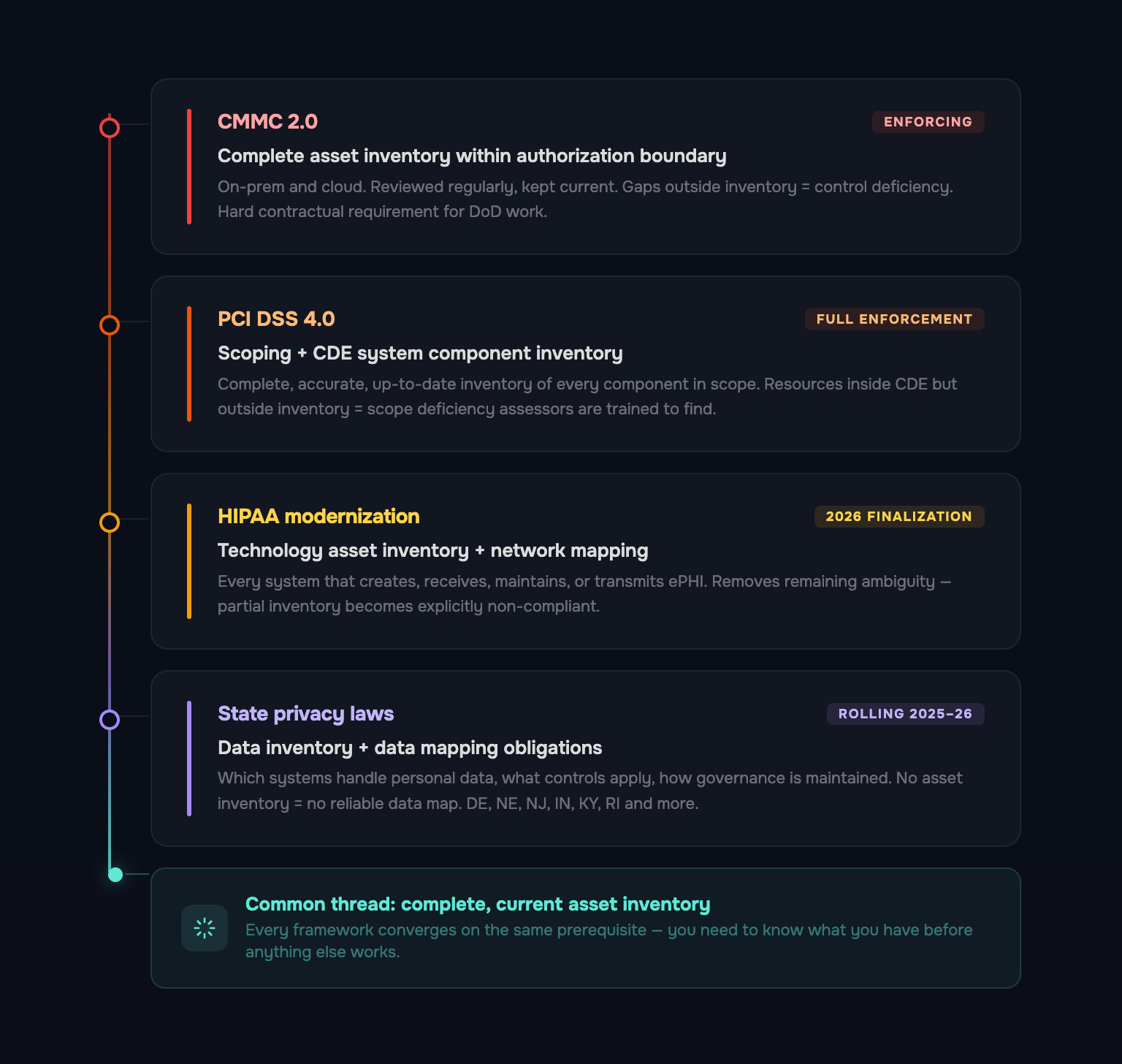 CMMC 2.0, HIPAA, PCI DSS 4.0, and state privacy laws now demand complete cloud asset inventories. Learn why full infrastructure visibility is a compliance prerequisite.