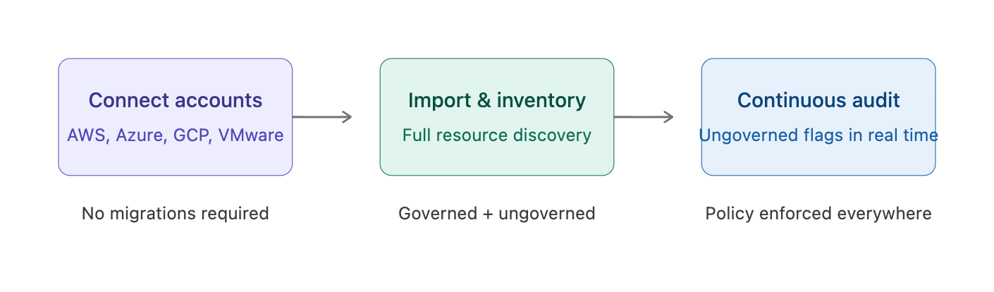 Visibility, governance, and monitoring tools that allow brownfield onboarding is how that answer changes. Not by building a new governance model from scratch, but by extending the one that already exists to cover the estate in its entirety, just like it was always supposed to cover. Full coverage must be available now, not at the end of a multi-year programme.