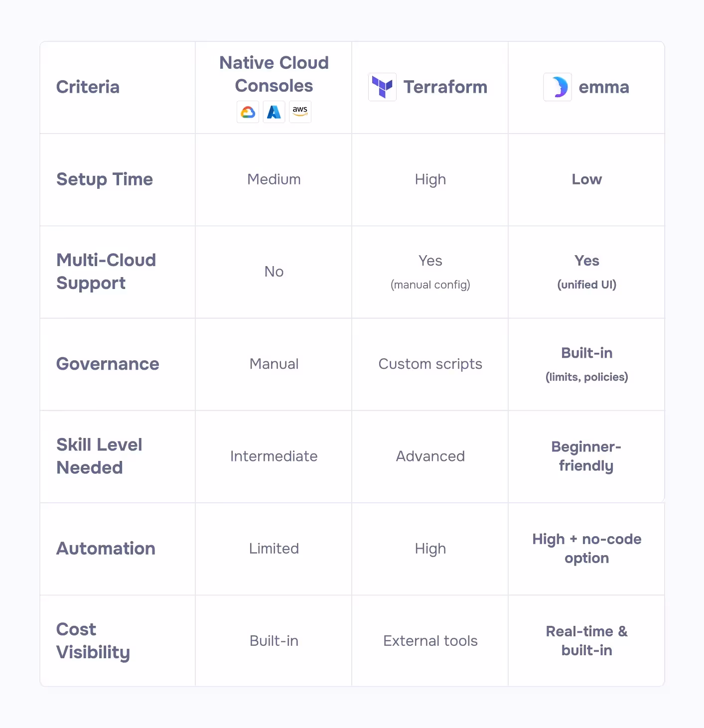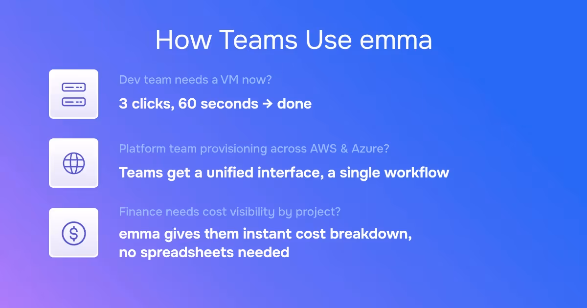 emma is a no-code, cloud-agnostic platform that offers click-to-deploy capabilities across all cloud providers. It makes VM provisioning truly self-service – no YAMLs, no scripts, no ticket queues.