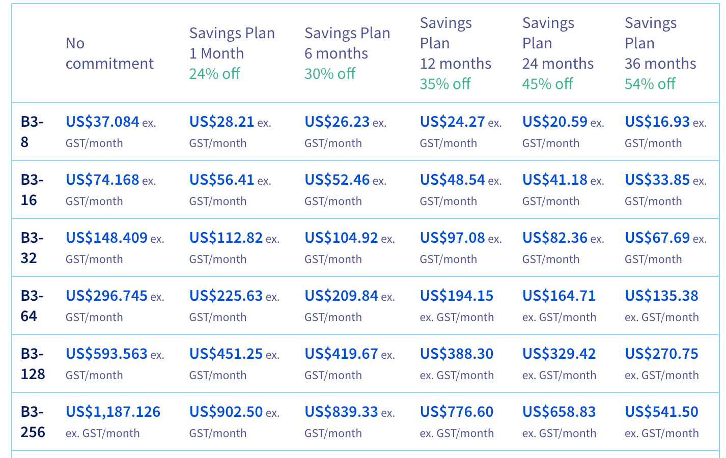 OVHcloud is known for transparent, highly competitive pricing with fewer hidden charges than AWS, Azure, or GCP. Its B3-8 instance is currently priced at $0.051 per hour or $37.084 per month. However, you can get up to 54% off with their Savings Plans.