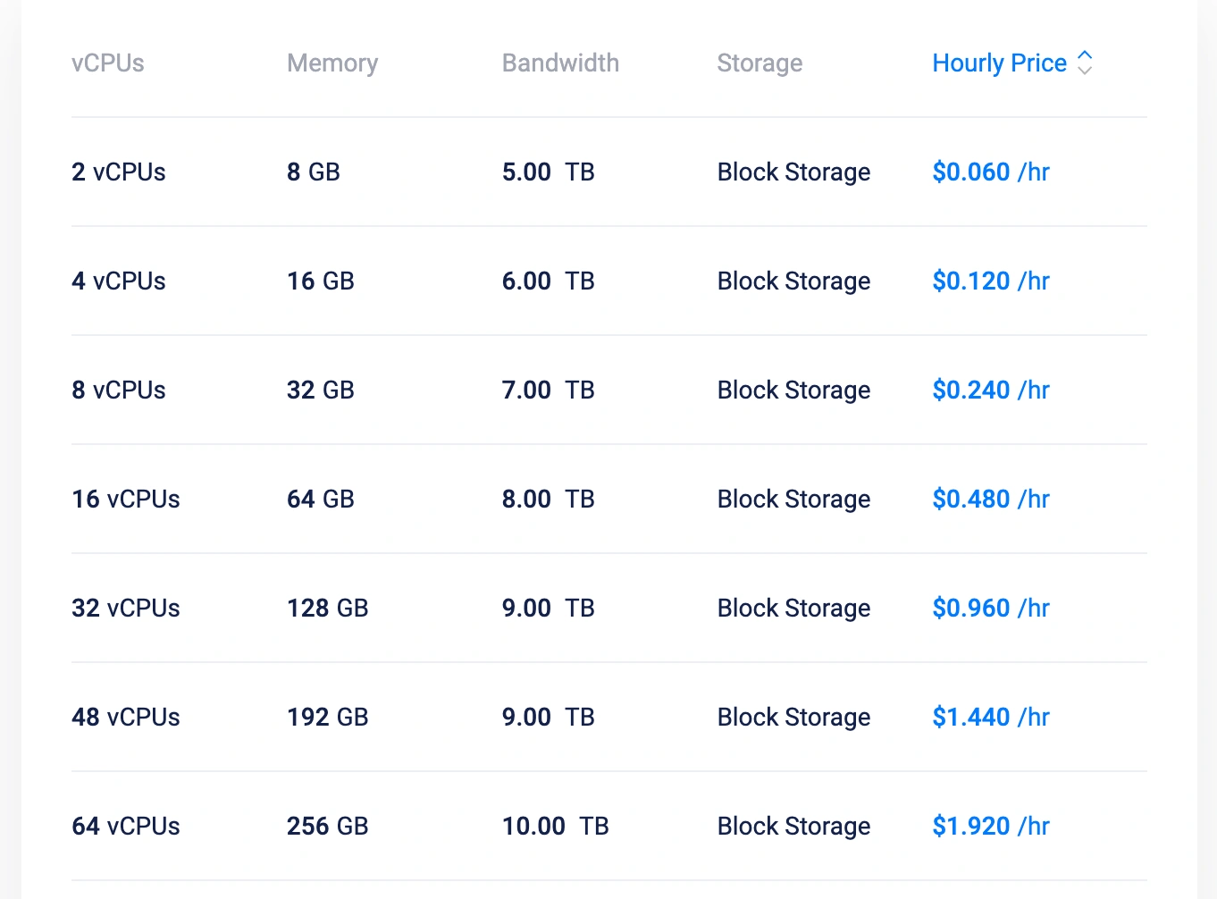 The Vultr plan with 2 vCPUs and 8 GB of RAM costs $0.06 per hour and $1.44 per day.