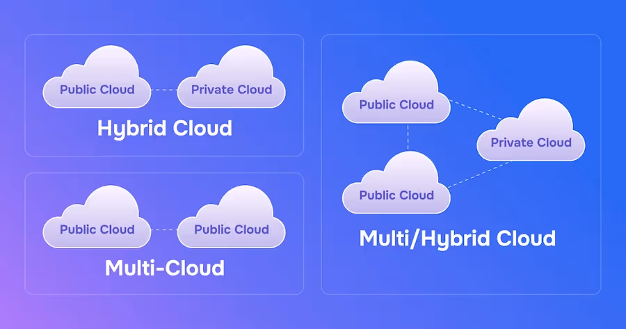 It mixes both approaches, combining on-premises infrastructure with multiple public clouds. For example, a healthcare provider might maintain patient records on private servers for HIPAA compliance, use one public cloud for AI-powered diagnostic tools, and another for patient portal applications with global reach.
