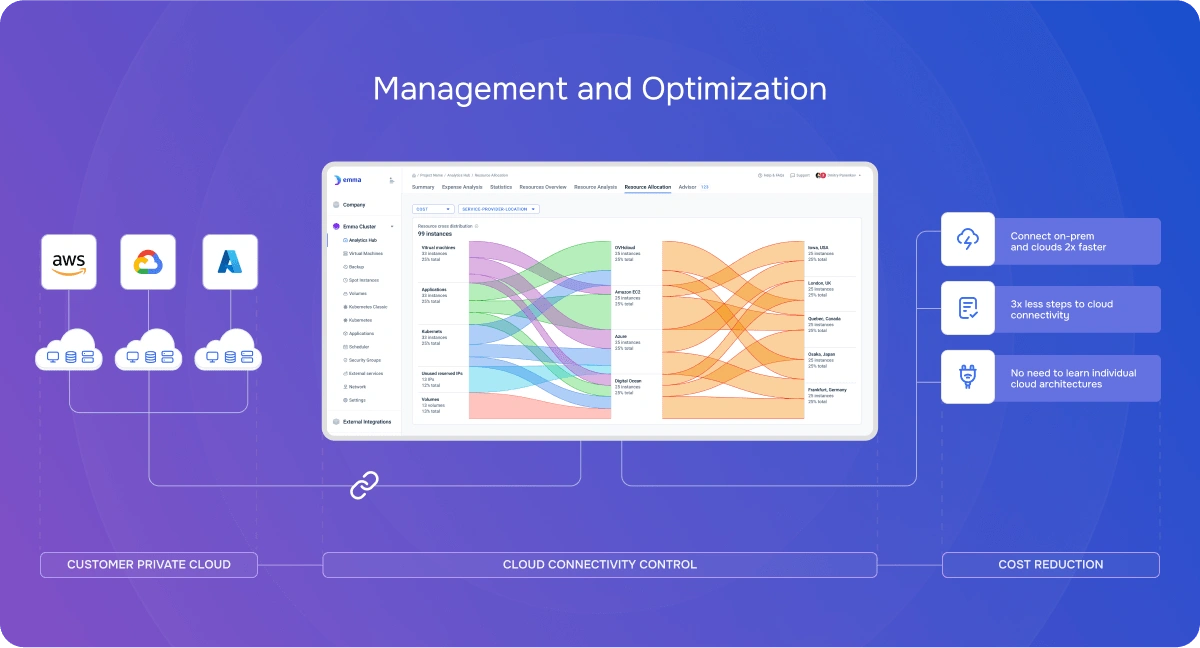 Unlike other solutions, which often require separate contracts and fees for each cloud provider, emma enables multi-cloud connectivity in a single service. Connect to AWS, Azure, Google Cloud, and other platforms without additional configurations or costs.